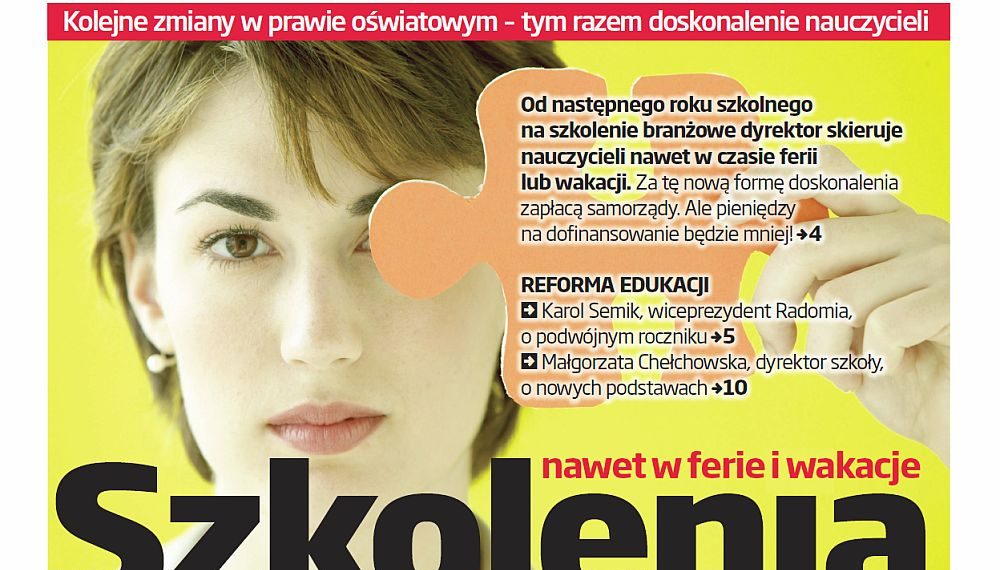 Od następnego roku szkolnego na szkolenie branżowe dyrektor skieruje nauczycieli nawet w czasie ferii lub wakacji. Za tę nową formę doskonalenia zapłacą samorządy. Dostaną na to pieniądze z kurczącej się rezerwy w budżecie. To jedna z wielu zmian, które maja wkrótce wejść w życie. Rząd przyjął obszerny projekt nowelizacji ustawy – Prawo oświatowe. Projekt liczy 245 strony i w miarę postępu prac legislacyjnych coraz bardziej się rozrasta. Więcej – w Głosie Nauczycielskim nr 40 z 3 października br.