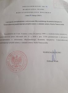 25 lutego br. otrzymaliśmy „Postanowienie Marszałka Sejmu RP z dn. 20.02.2020 r. o przyjęciu zawiadomienia o utworzeniu Obywatelskiego Komitetu Inicjatywy Ustawodawczej popierającego projekt ustawy o zmianie ustawy Karta Nauczyciela”.