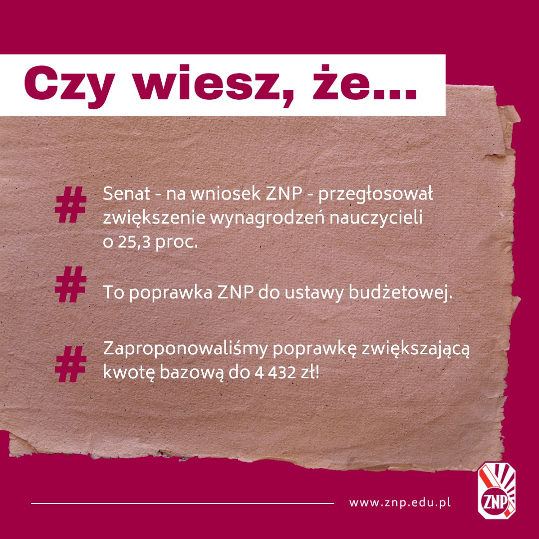 12 stycznia 2023 roku Senat przegłosował zwiększenie wynagrodzeń nauczycieli o 22,5%. To poprawka ZNP do ustawy budżetowej na 2023 rok. Na wniosek ZNP – przegłosowano poprawkę zwiększającą kwotę bazową do 4 432,15 zł.